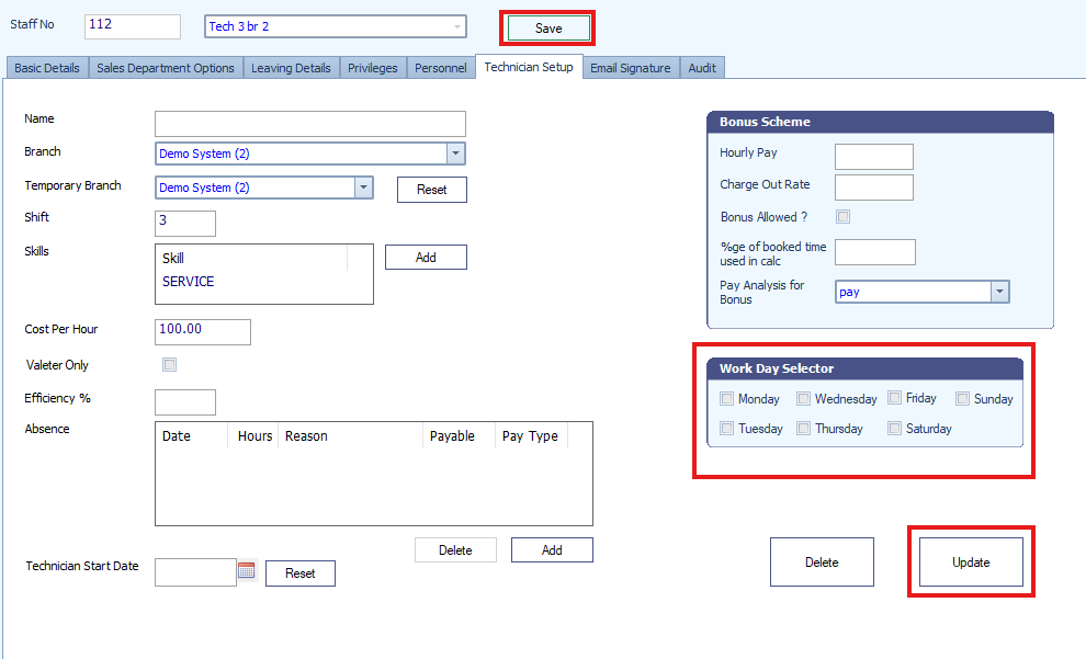 To do this within the Technician Setup tab, tick the days they work and press Update and Save once done