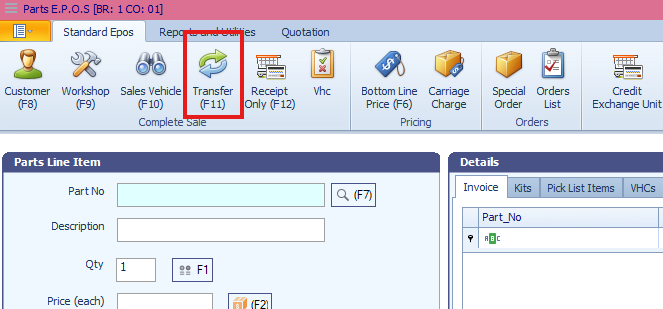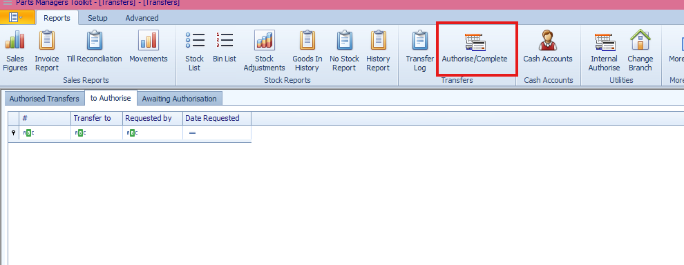 Select the "To Authorise" tab and double click the parts transfer request and press "Authorise"