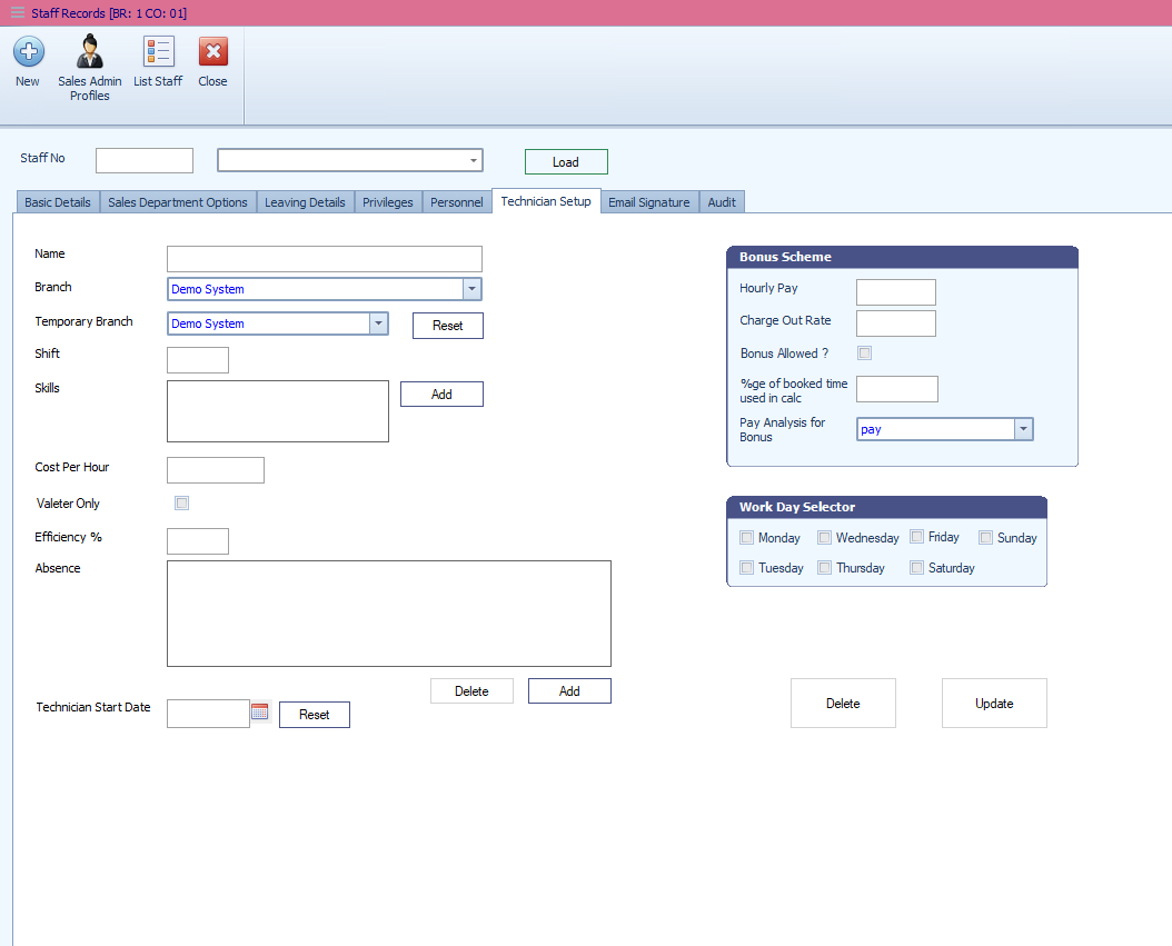 You can preload new technician starters and automatically assign their working hours on the diary.