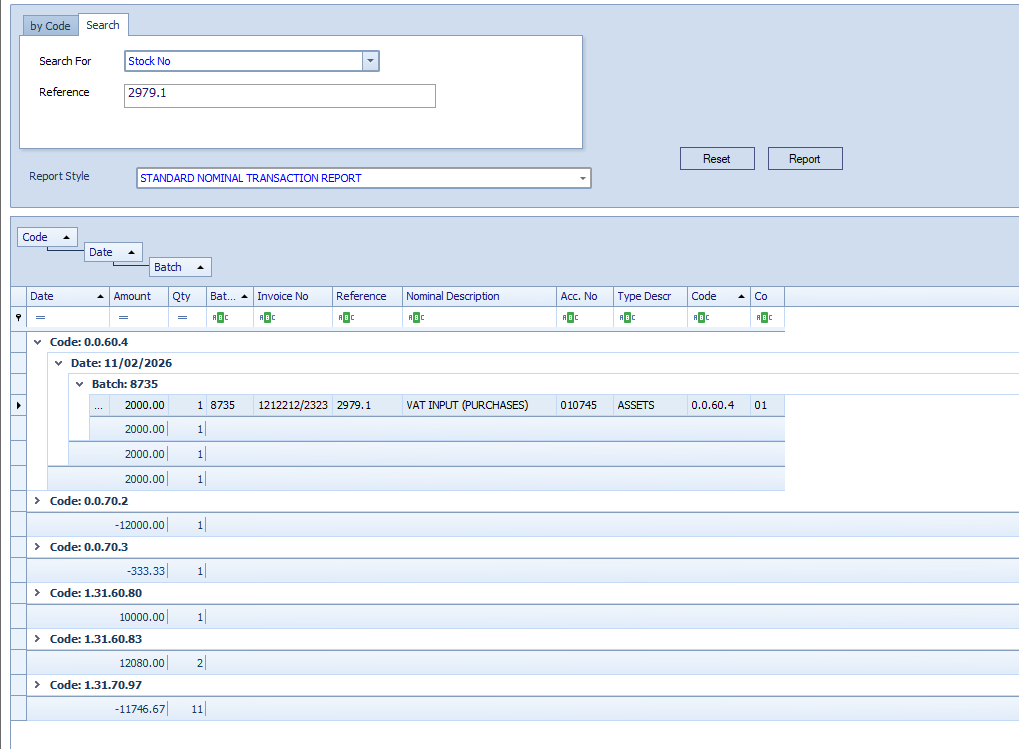 Layer multiple headers to create nested groups (e.g., grouping by 'Code' then 'Date' then 'Batch'), providing a more structured view of your transaction report data.