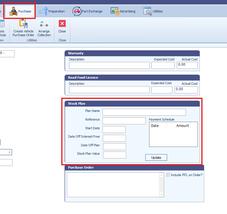 Use the Stock Plan fields on the Purchase tab of the stock record to include a vehicle in the funding feed like Lombard. These fields define which funding scheme applies, when the vehicle appears in the feed, and which value the funder uses for the vehicle.